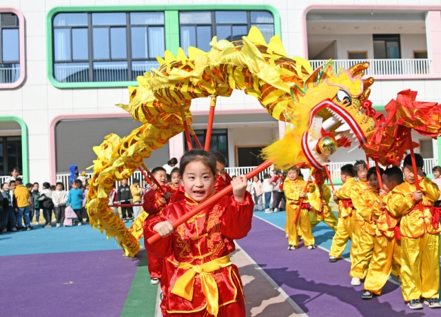 2024年3月8日,浙江省臺州市仙居縣迎暉幼兒園的孩子們正在舞龍表演,迎接“二月二 ”。當(dāng)日,仙居縣迎暉幼兒園開展迎接“二月二 龍?zhí)ь^”系列主題活動,孩子們在舞龍、畫龍、唱童謠等民俗活動中迎接“二月二”的到來。(中國教育報-中國教育新聞網(wǎng) 通訊員 王華斌 攝)