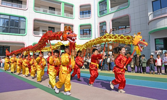 孩子們正在舞龍表演,迎接“二月二 ”。 王華斌 攝