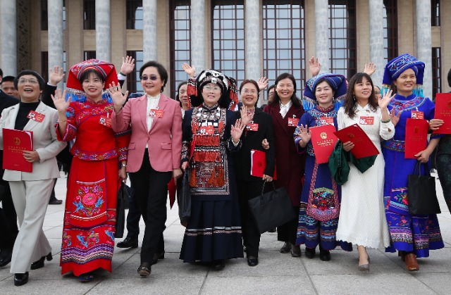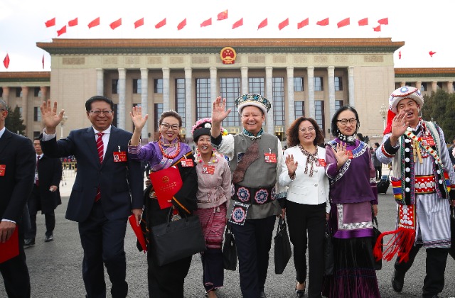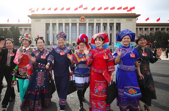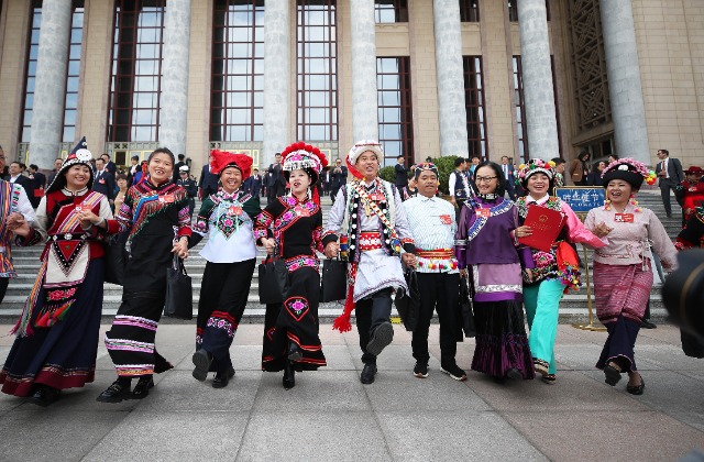 3月11日,第十四屆全國人民代表大會第二次會議在北京人民大會堂舉行閉幕會。這是閉幕會后,云南團代表們在人民大會堂東門外廣場載歌載舞。中國教育報-中國教育新聞網(wǎng)記者 張學(xué)軍 攝