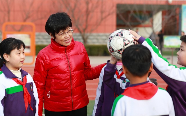 2023年2月21日,全國人大代表、山東省臨沂市北城小學黨總支張淑琴(左二)叮囑玩球的學生注意安全。