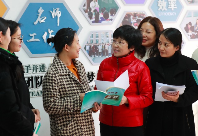 2023年2月21日,臨沂市北城小學名師工作坊,張淑琴(右三)與同事進行教學研討。