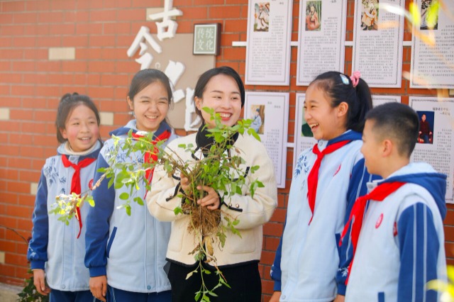 孩子們正在快樂分享中藥植物的知識(shí)。通訊員 謝貴明 攝