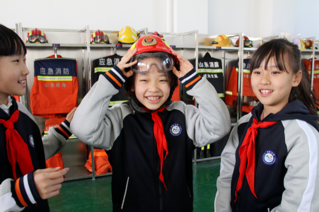 學(xué)生試戴消防頭盔。通訊員 宋永強 攝