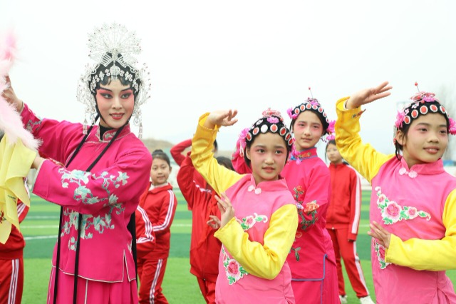 3月26日,在河北省唐山市豐潤區(qū)泉河頭鎮(zhèn)團(tuán)山子小學(xué),評劇演員教學(xué)生戲曲動作。通訊員 朱大勇 攝
