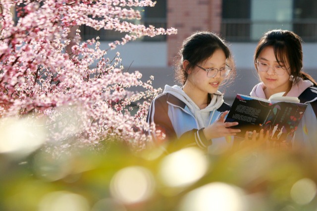 近日,山東省高密市第五中學(xué)校園內(nèi)春花陸續(xù)綻放,學(xué)生們趁著晴好天氣,利用大課間,在花叢中休閑讀書(shū),盡享校園好春光。中國(guó)教育報(bào)-中國(guó)教育新聞網(wǎng)通訊員 李海濤 攝