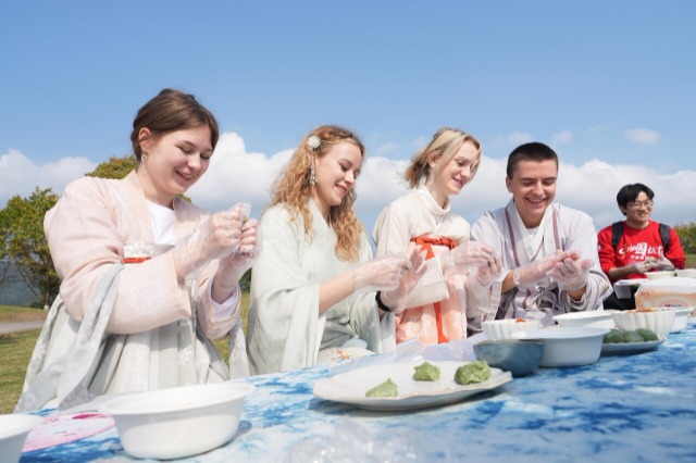 西南大學(xué)外國語學(xué)院的中外大學(xué)生體驗(yàn)做青團(tuán) 通訊員 秦廷富 攝