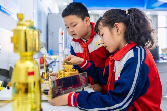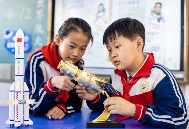 4月11日,內(nèi)蒙古呼和浩特市玉泉區(qū)石東路小學(xué)開(kāi)展“仰望星空 逐夢(mèng)航天”世界航天日主題科普活動(dòng),孩子們通過(guò)形式多樣的活動(dòng),學(xué)習(xí)航天科技知識(shí)、激發(fā)科學(xué)探索熱情。中國(guó)教育報(bào)-中國(guó)教育新聞網(wǎng)通訊員 丁根厚 攝