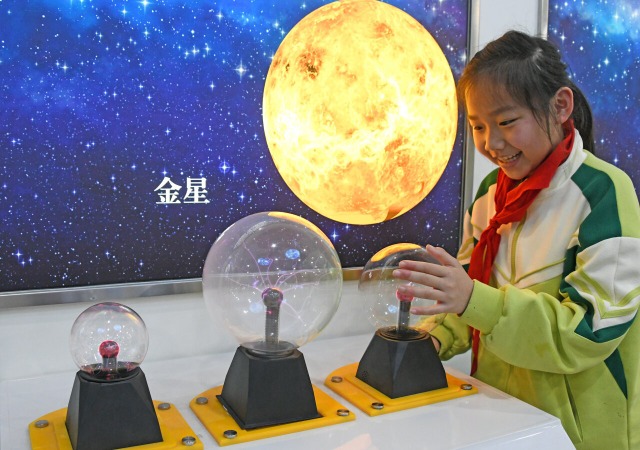 學生在??萍拣^學習航天科普知識。通訊員 王華斌 攝
