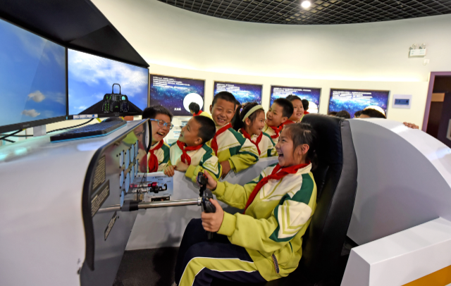 學生在校科技館操作飛行駕駛模擬器。通訊員 王華斌 攝