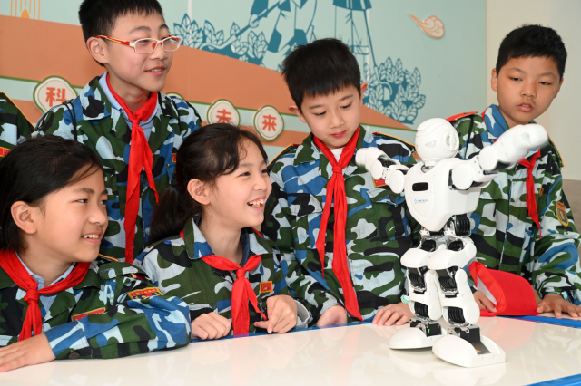 學(xué)生觀看智能機(jī)器人表演。通訊員 蘭自濤 攝