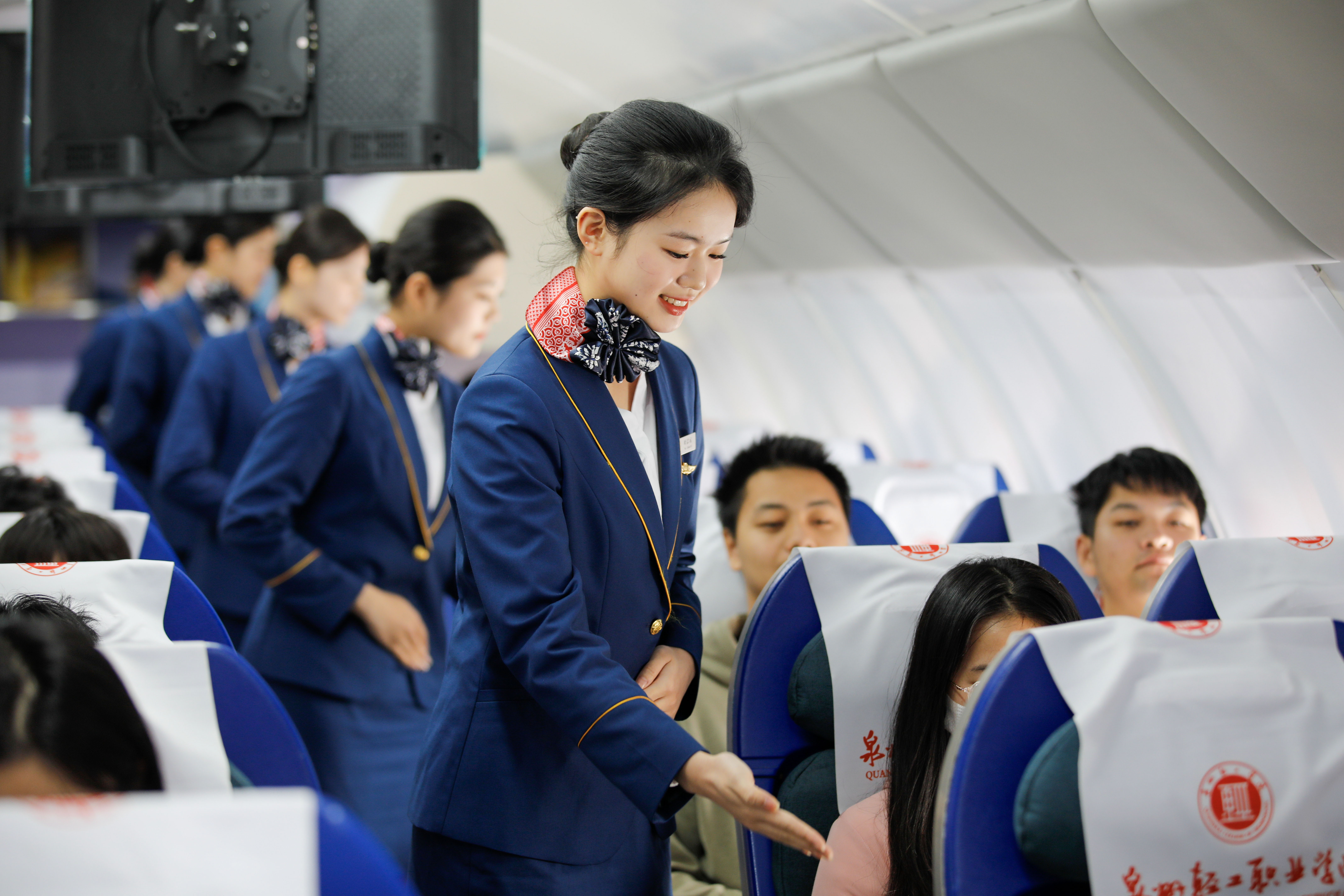 空中乘務(wù)專業(yè)的學(xué)生正在進(jìn)行安全提醒服務(wù)訓(xùn)練。通訊員 謝貴明 攝