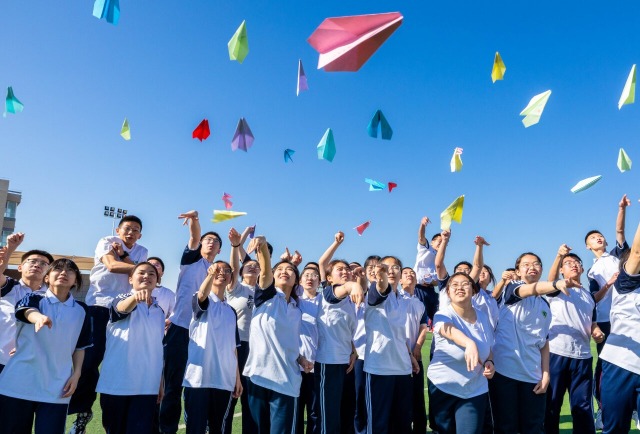 學(xué)生在操場上放飛寫有自己心愿的紙飛機。通訊員 丁根厚 攝