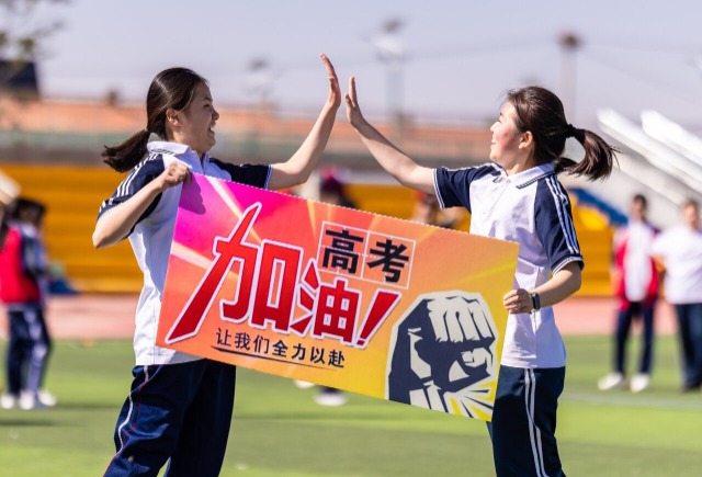 學(xué)生手持“高考加油”字樣在操場上做減壓游戲,相互擊掌鼓勁。通訊員 丁根厚 攝