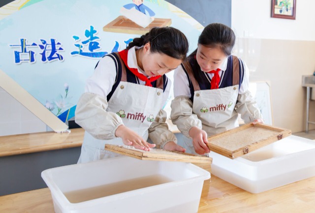 學(xué)生在體驗(yàn)古法造紙。通訊員 向中林 攝