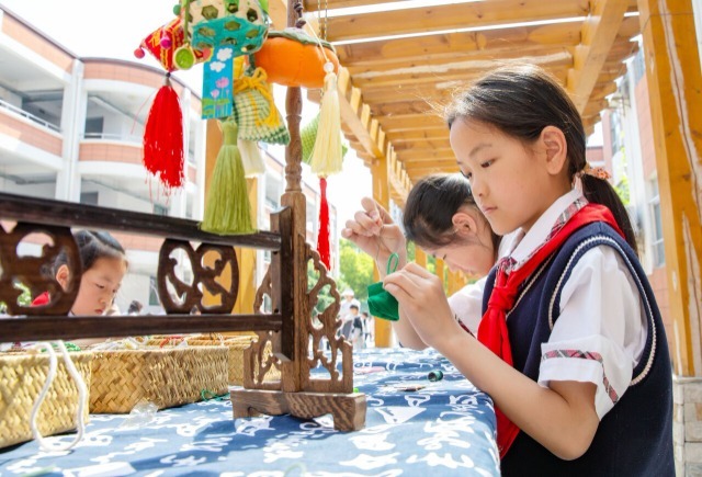 5月14日,江蘇省海安經(jīng)濟(jì)開發(fā)區(qū)實(shí)驗(yàn)小學(xué)舉辦首屆“非遺節(jié)”,該校各社團(tuán)展示了鉤花、繩結(jié)、扎染、剪紙、制作香囊、泥塑、葫蘆畫等傳統(tǒng)非遺技藝。近年來,江蘇省海安經(jīng)濟(jì)開發(fā)區(qū)實(shí)驗(yàn)小學(xué)積極推進(jìn)非遺進(jìn)校園,賦能學(xué)?!半p減”,讓更多學(xué)生接觸非遺、了解非遺、體驗(yàn)非遺、傳承非遺,在實(shí)踐操作與探究式學(xué)習(xí)融合中,感受中華傳統(tǒng)文化的魅力,增強(qiáng)文化自信。中國教育報(bào)-中國教育新聞網(wǎng)通訊員 向中林 攝