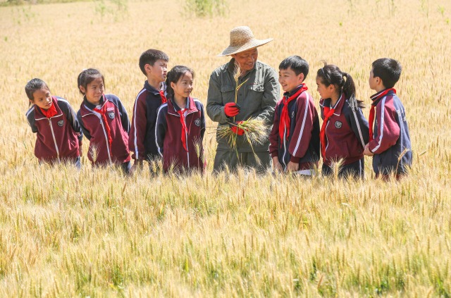 在浙江省湖州市德清縣康乾街道聯(lián)合村,農(nóng)民向?qū)W生講解小麥種植的知識(shí)。通訊員 王樹(shù)成 攝