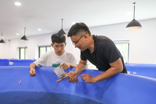 教師付寧(右)給學(xué)生講解龍蝦養(yǎng)殖專業(yè)知識。該校培育養(yǎng)殖的澳洲淡水龍蝦“東蝦西移”技術(shù)援疆項目,填補了沙漠龍蝦養(yǎng)殖的空白。中國教育報-中國教育新聞網(wǎng)記者 單藝偉 攝