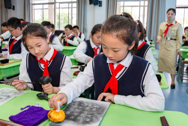 在5月18日國(guó)際博物館日到來(lái)之際,江蘇省海安市博物館工作人員走進(jìn)該市城南實(shí)驗(yàn)小學(xué)東校區(qū),將非遺“拓片”技藝送進(jìn)校園。博物館的老師給學(xué)生們講解拓片的歷史,指導(dǎo)學(xué)生進(jìn)行拓片的制作。學(xué)生們?cè)趯?shí)踐過(guò)程中感受中華傳統(tǒng)文化的魅力,形成保護(hù)文化遺產(chǎn)的意識(shí),感受博物館的力量。中國(guó)教育報(bào)-中國(guó)教育新聞網(wǎng)通訊員 向中林 攝