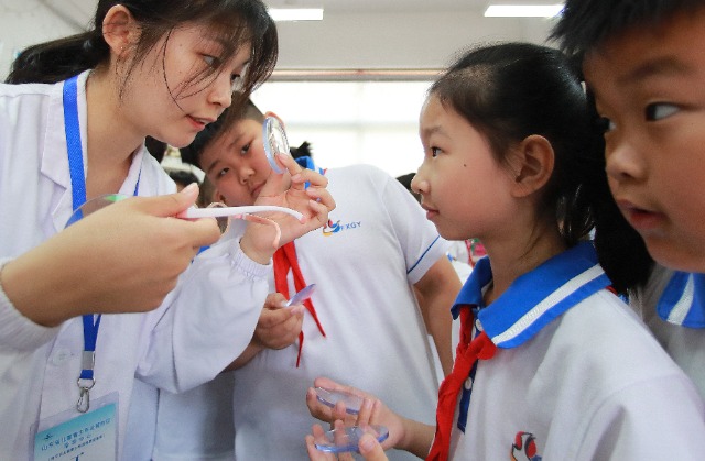 大學(xué)生志愿者在向小學(xué)生講解眼鏡的結(jié)構(gòu)和功能。