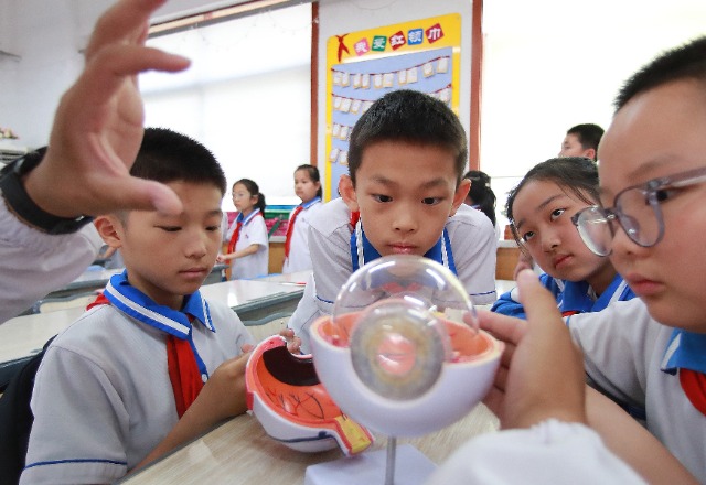科普活動(dòng)現(xiàn)場,一名學(xué)生對(duì)眼睛模型發(fā)生興趣。