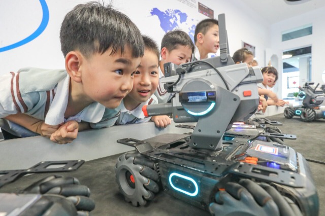 5月16日,浙江省湖州市德清縣地理信息小鎮(zhèn)幼兒園舉行第七屆科技節(jié),組織小朋友走進(jìn)地理信息科技館,近距離感受人工智能科技魅力,從小激發(fā)他們探索科學(xué)的興趣。中國教育報-中國教育新聞網(wǎng)通訊員 王樹成 攝