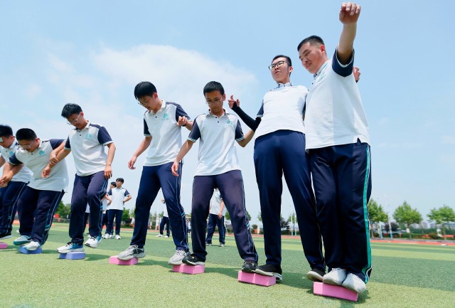 青島通濟實驗學校高三學生在進行“同心渡船”游戲 通訊員 梁孝鵬 攝