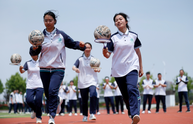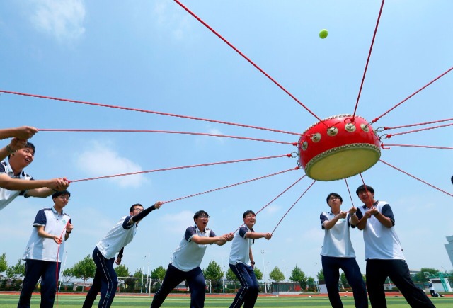 青島通濟實驗學校高三學生在進行“托起地球”比賽 通訊員 梁孝鵬 攝