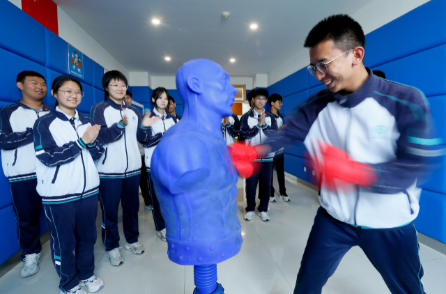 青島通濟實驗學校高三學生打“宣泄人”釋放壓力 通訊員 梁孝鵬 攝