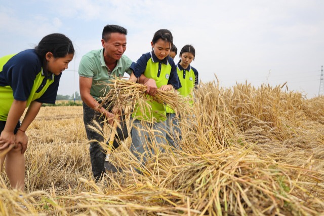 5月21日,湖北省襄陽市樊城區(qū)竹條實驗中學的學生們來到田間,在當?shù)卮迕竦闹笇率崭钚←?、撿拾麥穗,在沉浸式體驗中感受勞動的意義和農(nóng)忙時豐收的喜悅。近年來,襄陽市樊城區(qū)鼓勵各學校充分利用社會資源,帶領(lǐng)學生走進田間地頭開展勞動實踐活動,引導學生在掌握勞動技能、提升勞動素養(yǎng)的同時,感受鄉(xiāng)村振興的變化。中國教育報-中國教育新聞網(wǎng)通訊員 聶志鵬 攝