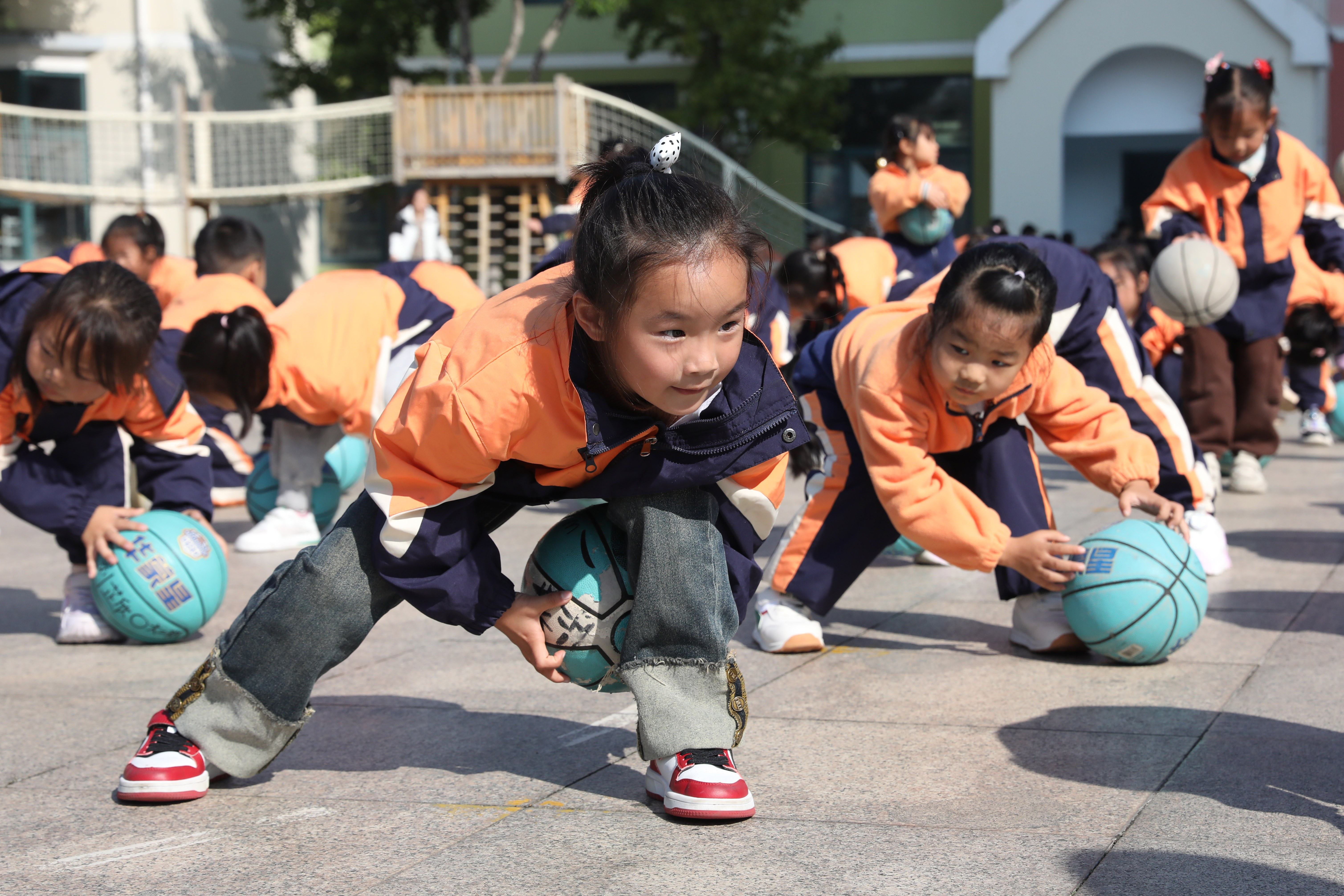 10月23日,在江蘇省淮安市高良澗幼兒園,小朋友們在做趣味籃球操。殷潮 攝