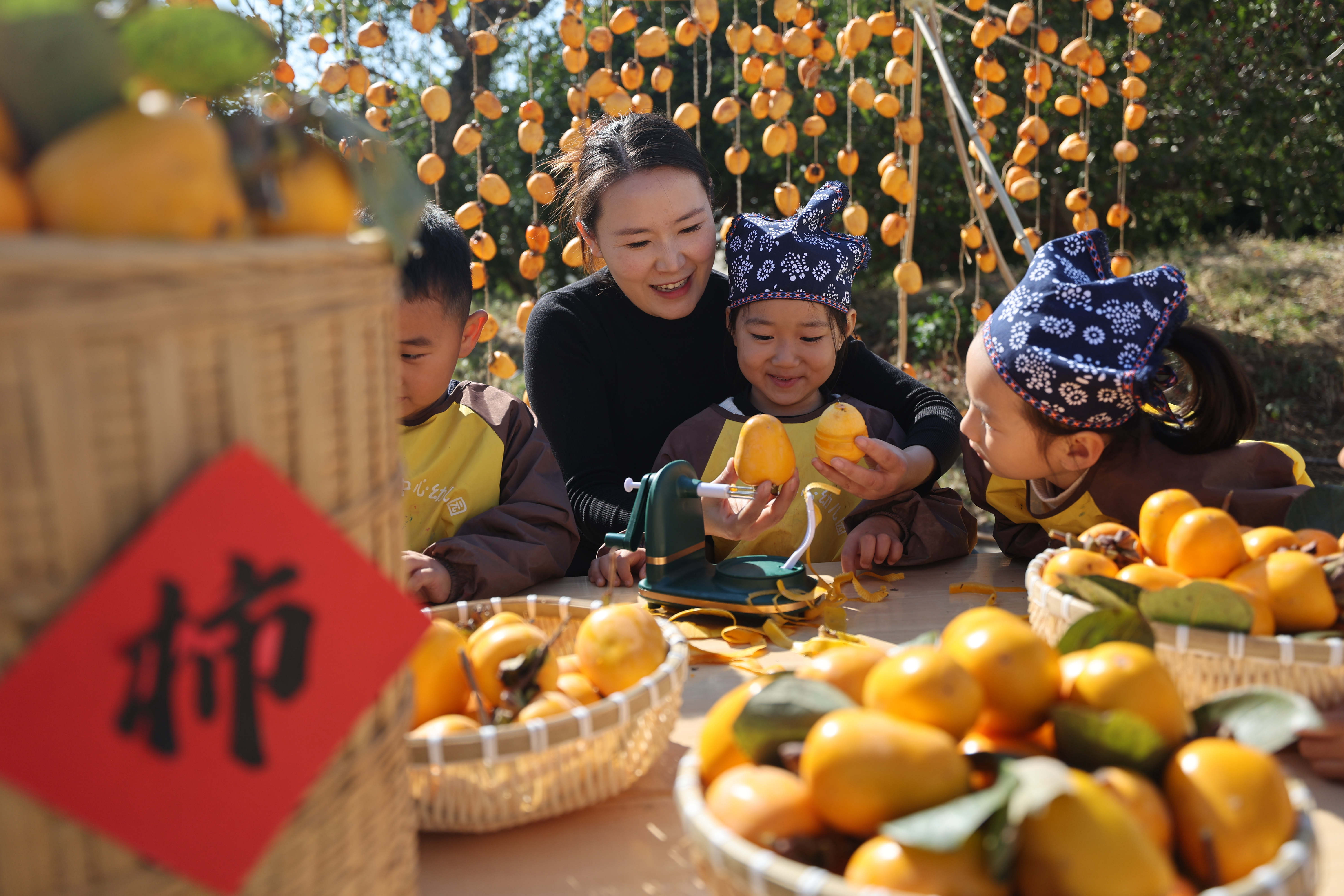 小朋友在老師的指導(dǎo)下給柿子削皮。王彥冰 劉艷麗 攝