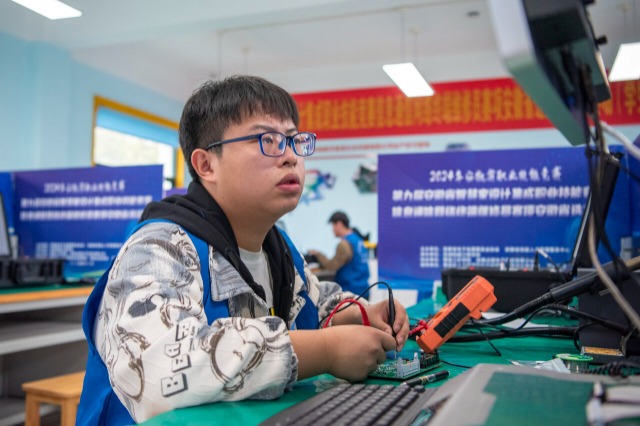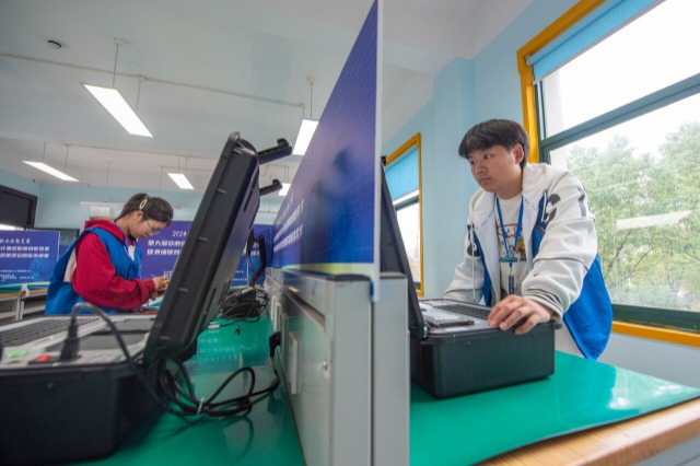 選手正在進(jìn)行信息通信網(wǎng)絡(luò)終端維修員賽項(xiàng)的比拼 肖本祥 攝