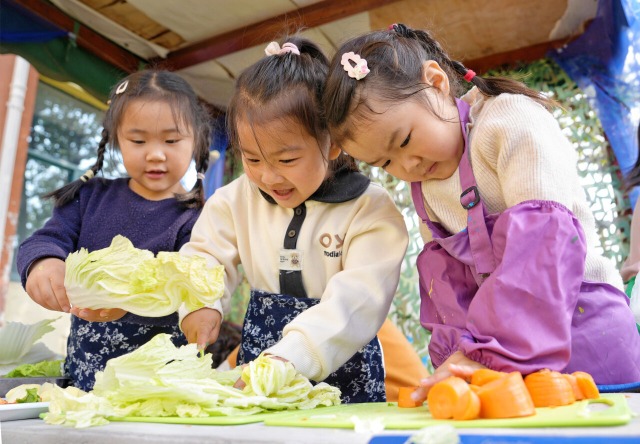 11月14日,在江蘇省海安市墩頭鎮(zhèn)吉慶幼兒園“戶外小廚房”內(nèi),小朋友們?cè)诶蠋煹闹笇?dǎo)下,學(xué)習(xí)洗菜、切菜、炒菜、生火做飯等勞動(dòng)技能,讓孩子們?cè)谟腥さ膭趧?dòng)教育中獲取生活經(jīng)驗(yàn),提升自理自立能力。(中國(guó)教育報(bào)-中國(guó)教育新聞網(wǎng) 通訊員 周強(qiáng) 攝)