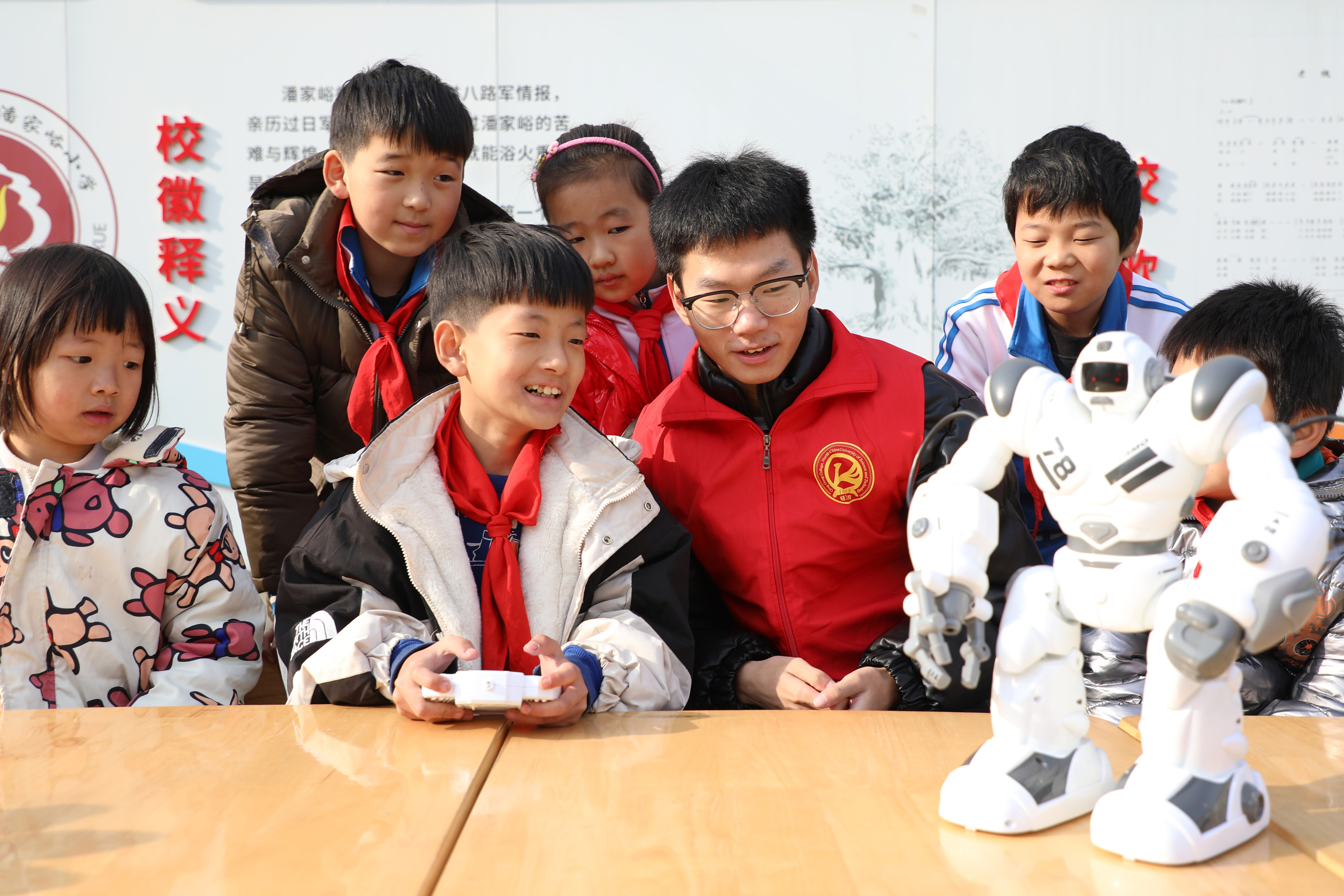 11月19日,河北省唐山市豐潤區(qū)潘家峪小學(xué),孩子們在大學(xué)生志愿者的指導(dǎo)下操作機(jī)器人。朱大勇 攝