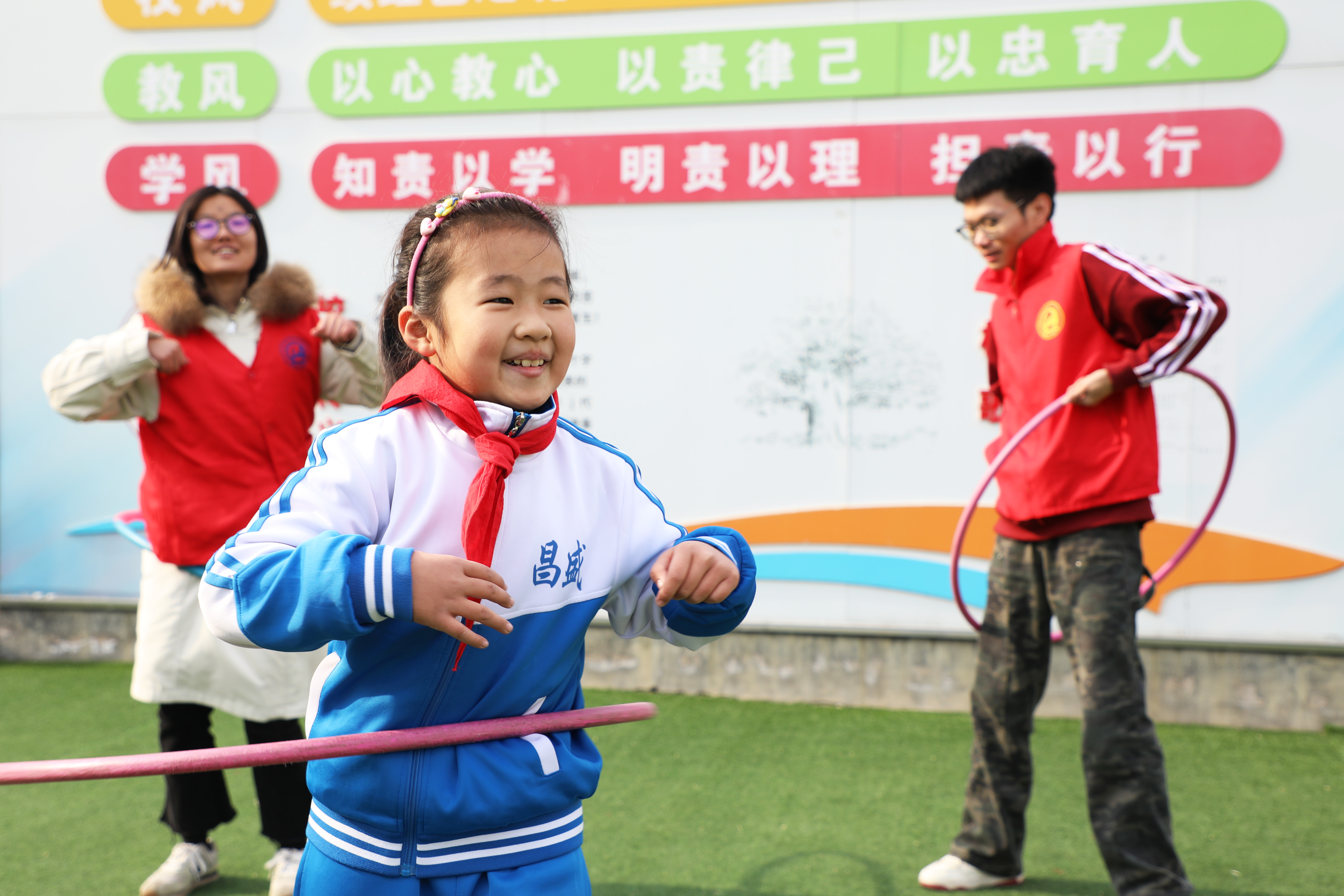 11月19日,河北省唐山市豐潤區(qū)潘家峪小學(xué),大學(xué)生志愿者和孩子們一起轉(zhuǎn)呼啦圈。朱大勇 攝