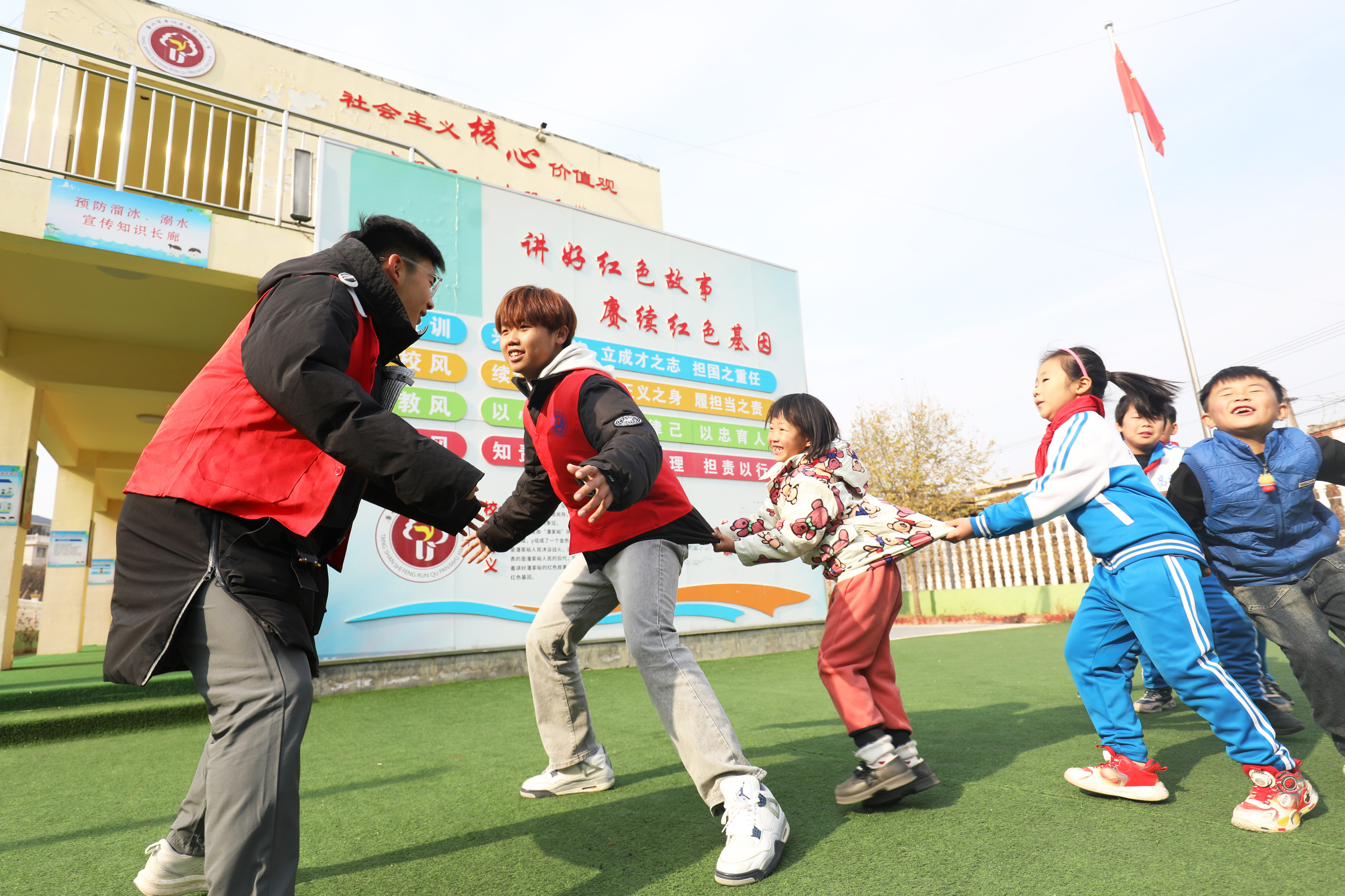 11月19日,河北省唐山市豐潤區(qū)潘家峪小學(xué),孩子們和大學(xué)生志愿者一起做游戲。朱大勇 攝