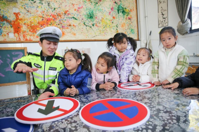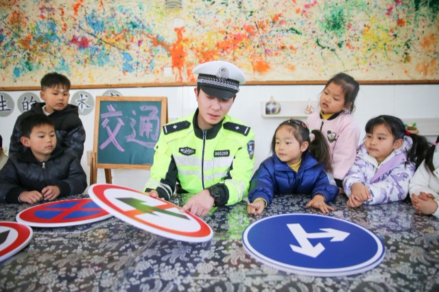 民警向小朋友展示、講解交通標(biāo)識和交通出行知識。通訊員 徐慧 攝