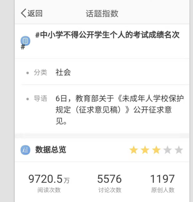 #未成年人學(xué)校保護(hù)規(guī)定##學(xué)校不得因家長職業(yè)等對學(xué)生區(qū)別對待##中小學(xué)要制止教職工與學(xué)生發(fā)生戀愛關(guān)系##教育部擬規(guī)定中小學(xué)禁止師生戀##學(xué)校不得公開學(xué)生成績和排名##學(xué)校應(yīng)建立對欺凌零容忍機(jī)制#等數(shù)條內(nèi)容沖上熱搜。截至7日上午11點(diǎn),以上話題的新浪微博總閱讀量超過3億。