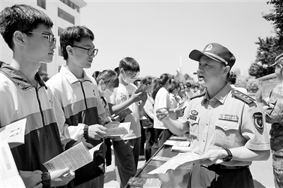 5月27日,安徽省淮北市杜集區(qū)人武部機(jī)關(guān)干部向?qū)W生宣傳征兵政策和報(bào)名流程。當(dāng)日,淮北市杜集區(qū)人武部機(jī)關(guān)干部攜手優(yōu)秀退役士兵走進(jìn)淮北市第十二中學(xué)開(kāi)展征兵宣傳活動(dòng),動(dòng)員優(yōu)秀的適齡青年響應(yīng)祖國(guó)號(hào)召,接受祖國(guó)挑選,投身國(guó)防建設(shè)。萬(wàn)善朝 攝