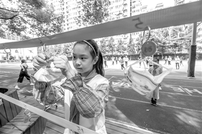 近日,上海市疾控中心表示,學(xué)生在室外(戶外)上體育課進(jìn)行非近距離肢體接觸項(xiàng)目,可以不戴口罩。為在學(xué)生復(fù)學(xué)復(fù)課后有序推進(jìn)體育課項(xiàng)目,上海市第一師范學(xué)校附屬小學(xué)體育老師在操場上自創(chuàng)“口罩欄”?!翱谡謾凇鄙嫌行驋焐腺N有學(xué)生學(xué)號的小夾子,采用“一班一網(wǎng)、一生一夾”的方式,體育老師在體育課前后的課間對“口罩欄”噴霧消毒。