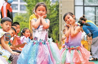 6月3日,安徽省合肥市廬陽區(qū)林店街道永清社區(qū)聯(lián)合當(dāng)?shù)赜變簣@開展“環(huán)保時(shí)裝秀,迎接世界環(huán)境日”活動(dòng)。小朋友穿著用塑料袋、舊報(bào)紙、廢布料等廢棄物品制作的環(huán)保服飾進(jìn)行展示,迎接6月5日世界環(huán)境日的到來。