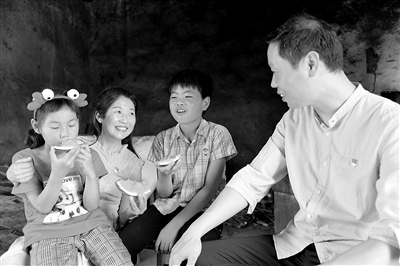 6月2日,江蘇省盱眙縣河橋中心小學(xué)黨員教師徐恒青(右一)和周從英(左二),利用午休時(shí)間看望學(xué)生“兒女”楊諾言、楊笑笑兄妹倆,送去兒童節(jié)的禮物。為了讓家庭經(jīng)濟(jì)困難學(xué)生有一個(gè)快樂的童年,該校組建了“留守兒童愛心家庭”,教師們成為留守兒童的“爸媽”,定期開展志愿服務(wù),解決留守兒童生活和學(xué)習(xí)困難。