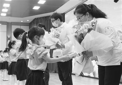日前,北京大學(xué)醫(yī)學(xué)部幼兒園為孩子們送上了一份特別的“六一”國際兒童節(jié)禮物??箵粢咔槠陂g,北京大學(xué)醫(yī)學(xué)部派出了實(shí)力強(qiáng)大的援鄂醫(yī)療隊(duì),其中就有北醫(yī)幼兒園6位小朋友的家長?!傲弧眹H兒童節(jié)前夕,幼兒園邀請6位馳援武漢的家長醫(yī)生為孩子們講述他們在武漢抗疫的故事,希望孩子們從小就能具備克服困難的勇氣,愿意分享與給予,懂得珍惜并學(xué)會愛。圖為孩子們給醫(yī)生家長獻(xiàn)上鮮花和自己親手制作的小禮物。