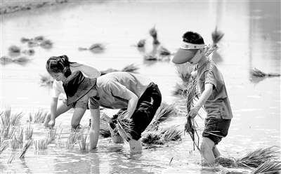 6月7日,孩子和家長體驗稻田插秧。當日,在浙江省杭州市富陽區(qū)東洲街道紅旗村的勞動教育實踐基地,數(shù)百名中小學(xué)生與家長參加了趣味插秧和渾水摸魚等活動,體驗農(nóng)事勞動。新華社記者 徐昱 攝