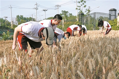 近日,北京中學的師生們在校園里收割麥子。該校建校之初就在校園內開辟“田園大課堂”,讓學生都能完整地體驗從播種到收獲的過程,感受勞動的喜悅。
