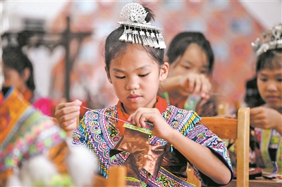 近日,在廣西柳州市融水苗族自治縣苗家小鎮(zhèn)彩云苗藝民族刺繡基地,小學(xué)生在學(xué)習(xí)刺繡。為豐富校園文化生活,讓學(xué)生掌握、傳承和發(fā)展本地少數(shù)民族傳統(tǒng)手工技藝,當(dāng)日,該縣開(kāi)展苗族刺繡進(jìn)校園活動(dòng),易地扶貧搬遷安置點(diǎn)的苗家小鎮(zhèn)小學(xué)46名學(xué)生參加刺繡學(xué)習(xí)。