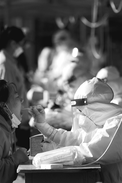 近日,山西師范大學強化疫情防控措施,組織教職工志愿者投身校園疫情防控工作,配合學校做好廣大師生員工健康狀況和風險接觸信息的摸排等工作。圖為醫(yī)護人員在為學生進行核酸檢測。張?zhí)N強 攝