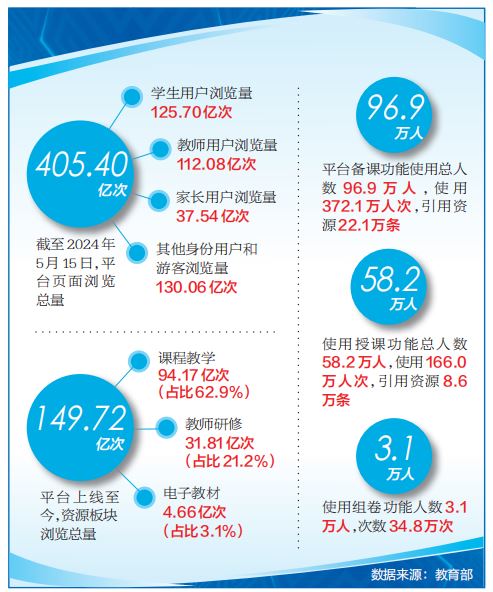 本報(bào)訊(記者 林煥新)今年是國家教育數(shù)字化戰(zhàn)略行動(dòng)實(shí)施第三年,也是數(shù)字教育“擴(kuò)優(yōu)提質(zhì)年”。教育部以國家中小學(xué)智慧教育平臺(tái)(簡稱平臺(tái))全域應(yīng)用試點(diǎn)工作為新舉措,以“集成化、智能化、國際化”為新要求,縱深推進(jìn)平臺(tái)全域深化應(yīng)用,以數(shù)字化助力基礎(chǔ)教育擴(kuò)優(yōu)提質(zhì)。平臺(tái)上線以來,服務(wù)領(lǐng)域和應(yīng)用規(guī)模不斷擴(kuò)大,特別是試點(diǎn)工作啟動(dòng)以來,平臺(tái)瀏覽量持續(xù)走高,截至2024年5月15日,平臺(tái)頁面瀏覽總量已達(dá)405.40億次。
