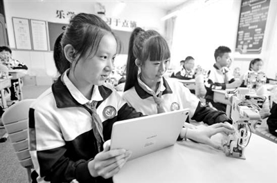 近日,山東省青島市市北區(qū)平安路第二小學(xué)開展“校園科技之光”主題活動,學(xué)生用平板電腦編寫程序操控機(jī)器人。王海濱 攝